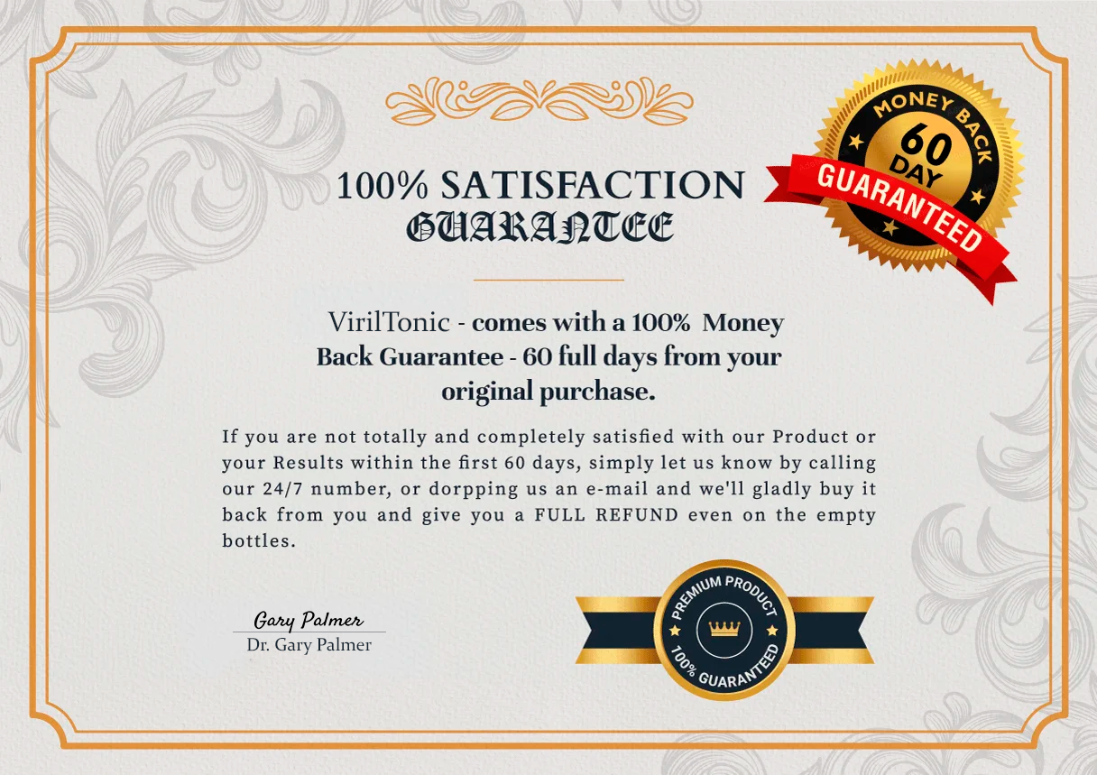 If you’re not completely satisfied with VIRILTONIC, or the results you experience within the first 60 days, reach out to us using the contact form on this site, and we’ll send you a full refund for anything you’ve ordered—no questions asked.